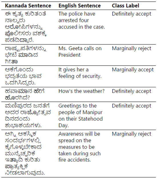 We use the TensorFlow library for the implementation of the proposed approach. The implemented code is run on an 11th Gen Intel(R), Core-i5, 2.70 GHz Processor with 16 GB RAM and NVIDIA GeForce RTX 3050 GPU having 8 GB memory. Our pre-processing tasks involve steps, like eliminating stop words, tagging parts of speech-disambiguating word senses, and filtering words using WordNet. Our implementation source code is available at https://github.com/muralikrishnasn/Kannada_English_STS (accessed on 10 July 2024). In our experiments, we use the Samanantar Parallel Corpora Dataset [76] to evaluate the performance of the proposed method. The Samanantar Corpora (https://ai4bharat.iitm.ac.in/samanantar (accessed on 11 June 2024) is available for pairs of sentences in English and 11 Indic languages. The sources of this dataset are the WAT 2021 MultiIndicMT shared task, OPUS, and other sources. The dataset comprises 49.7 M parallel sentences between English and 11 Indic languages, out of which 12.4 M are taken from the existing sources. The remaining 37.4 M sentences are scraped from various online content. This shows that the data used for experimentation are from diverse domains. During dataset preparation, to determine the sentence pair from the scrapped text, the LabSE score is used. Also, a subset of the collected data were manually annotated for semantic sentence similarity (STS) into three classes, namely definitely accept, marginal accept, and reject, as shown in Figure 4. The annotation was performed by sampling 9.566 K English–Indic sentence pairs across 11 Indic languages. The Kannada–English pair has 0.957 K annotated sentences, out of which 70% are used for training and the remaining samples are used for testing.