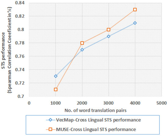 VecMap and MUSE are both powerful tools for cross-lingual word embeddings, but they have different approaches and features. Based on the findings in Table 1 and Table 2, it is evident that determining the superiority between VecMap and MUSE is not straightforward. The choice between these methods relies on the specific demands and limitations of our embedding-space-alignment task. Nonetheless, it is worth noting that MUSE demonstrates an improved performance for the KAN-ENG language pair when equipped with a dictionary containing more than 2 K word pairs, as shown in Figure 5. Also, VecMap requires bilingual dictionaries or parallel data and has broader language support, while MUSE can be trained with monolingual data alone and has demonstrated a competitive performance in various tasks.