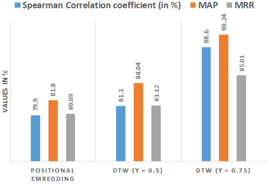 No substantial progress has been made in the domain of Kannada–English short-text semantic similarity, making the proposed work one of a kind. We conducted a comparative study using state-of-the-art techniques [19]: OptAlign, GrAssoc, and Aggreg, and the results are presented in Table 2. However, it is evident from the literature that only a few methods have been developed for research on cross-lingual semantic similarity between Kannada and English sentences. The performance of STS at the sentence level is measured in terms of the Spearman correlation coefficient (in % @rank-5) with the human-annotated labels for 4 K sentences. Also, we measure the Mean Reciprocal Rank (MRR) and Mean Average Precision (MAP) to evaluate the retrieval task. Finally, we assess the effectiveness of the proposed method for semantic similarity considering word-embedding alignment with different bilingual dictionary sizes. In Figure 5, we can observe that the word-embedding alignment has no significant improvement beyond the 4 K bilingual dictionary. Also, we conducted a comparative analysis of cross-lingual STS performance on word order using positional embedding and DTW, as shown in Figure 6.