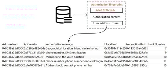 The database is synchronized with the blockchain. In Figure 3, The table comprises attributes such as addressFrom, addressTo, authorizationMessage, blockHash, transactionHash, and blockNumber. The meaning of each attribute is described in Table 1.