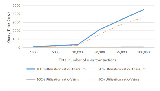 We first evaluated the performance of the VAIMS system for querying authorized transactions. We compared the efficiency difference between Ethernet and the VAIMS query system we developed. In Figure 6, we tested different numbers of transactions, including 1000, 5000, 10,000, 50,000, 75,000, and 100,000 transactions. We also evaluated the impact on transaction query efficiency when the authorization success rate is set to 50% and 100%. As the number of transactions queried increases, the query time for Ethernet shows a significant increase. In contrast, the VAIMS system maintains a relatively low query time. This is because in blockchain querying, one must start from the genesis block and query along the chain until reaching the current block height to ensure no content is omitted. However, after introducing the database in VAIMS, related aspects need not be considered. Moreover, for users, only the information of successful authorizations needs to be stored. Invalid authorizations or rejected authorizations are not stored in the database. Storing only valid content further improves query efficiency. In the blockchain, whether the authorization is successful or not, the corresponding block will be added to the chain. As the chain length increases, the query efficiency of blockchain-based methods will decrease, further widening the gap in query time between VAIMS and Ethereum.