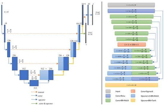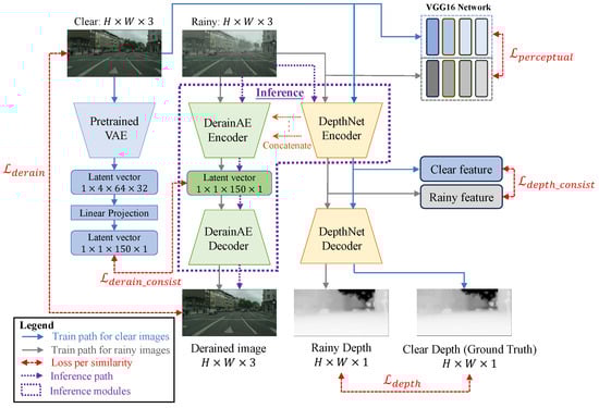 Figure 2, right) that also adopts an encoder–decoder architecture. Features from the DepthNet encoder are concatenated with the corresponding feature levels of the DerainAE encoder, establishing a shared learning mechanism that effectively leverages depth information for improved deraining performance. In our implementation, the DepthNet encoder employs the VGG16 architecture, allowing the model to leverage depth information to better understand the spatial structure and geometry of the scene, which is crucial for accurate rain removal. The decoder employs transposed convolutions to progressively upsample the feature maps, restoring them to the original input resolution. To preserve high-resolution details, skip connections are implemented between the encoder’s convolutional blocks and their corresponding layers in the decoder, following the design principles of the U-Net architecture. Additionally, the decoder incorporates multiple convolutional layers to effectively fuse information across different spatial resolutions. The network predicts disparity maps at multiple scales and resolutions using convolutional layers with sigmoid activation functions.