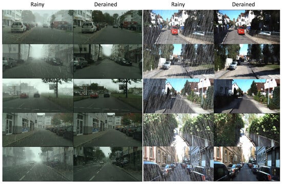 Visualization results of RainCityScapes and RainKITTI2012 dataset. The first two columns are exemplar images from the RainCityScapes dataset and corresponding derained outputs; the last two columns are exemplar images from the RainKITTI2012 dataset and corresponding derained outputs.