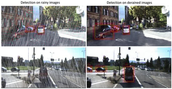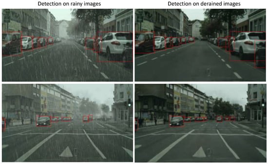 Vehicle detection results of RainKITTI2015 test dataset. We calculate mean precision and mean recall on 4189 images. The results shows that our deraining model significantly improves object detection recall.