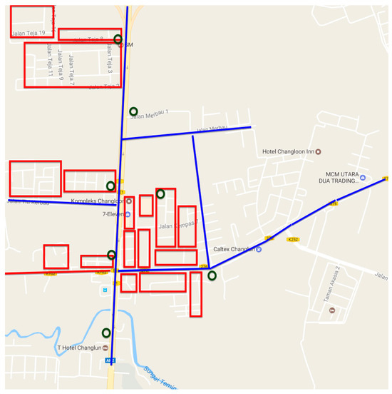 Changlun City map extraction: blue lines and red lines represent internal city roads, and the green line represents the highway road.
