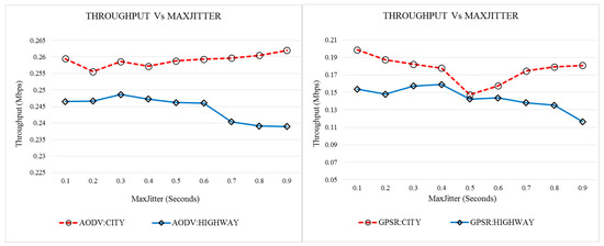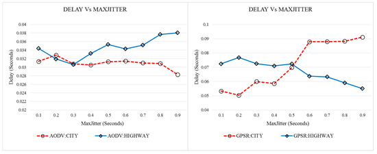 Figure 3 shows the throughput behavior of AODV and GPSR in city and highway environments across varying MaxJitter values. The data show a notable divergence in how each protocol reacts to increasing MaxJitter in different scenarios. In urban settings, AODV throughput increases with a higher MaxJitter, whereas on highways, AODV’s throughput decreases as MaxJitter rises. GPSR exhibits a decreasing trend toward a MaxJitter of 0.5 s in city environments and continues to decrease proportionally with MaxJitter on highways. MaxJitter introduces a random time interval between the transmission of consecutive packets, which helps mitigate packet collisions. According to the study in [23], a higher MaxJitter can reduce the probability of collisions, but it may also induce performance degradation due to increased delays between packet transmissions. This behavior explains the observed performance of AODV and GPSR in highway environments, where vehicles are often aligned in straight lines, leading to non-overlapping transmission ranges. In such cases, a lower MaxJitter is preferable, as the lower collision probability allows for smoother transmission without the need for large timing gaps between packets. Consequently, AODV experiences a performance drop with a higher MaxJitter in highway scenarios due to unnecessary delays in packet transmission. Conversely, in urban environments, vehicles are densely positioned within smaller areas, causing their transmission ranges to overlap frequently, leading to a higher likelihood of collisions. In this context, higher jitter values are more effective as they introduce greater randomness in packet transmission times, reducing the chances of packet collisions. This explains the increased throughput observed for AODV in city environments as MaxJitter rises, as the protocol benefits from reduced interference and packet losses. On the other hand, GPSR’s performance in both city and highway settings deteriorates with an increasing MaxJitter, likely due to the protocol’s sensitivity to delays introduced by higher jitter values, particularly in dynamic environments. In summary, the observed throughput trends highlight the impact of network topology and MaxJitter on routing protocol performance. AODV benefits from a higher MaxJitter in city environments due to reduced collisions but suffers on highways where collision risks are naturally low. In contrast, GPSR exhibits performance degradation as MaxJitter increases, suggesting a more sensitive response to delayed transmissions in both scenarios. These findings emphasize the importance of tuning MaxJitter to specific network conditions to optimize routing efficiency.