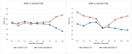 The jittering effects observed on throughput also extend to the Packet Delivery Ratio (PDR), as illustrated in Figure 4. Both AODV and GPSR exhibit distinct PDR behaviors depending on the MaxJitter values in city and highway environments. In highways, the PDR for both protocols is higher when MaxJitter is low and gradually decreases as MaxJitter increases. In contrast, in city environments, PDR is lower at smaller MaxJitter values but improves proportionally as MaxJitter rises. This pattern can be attributed to similar underlying dynamics that influence throughput. In urban areas, vehicle density is higher, leading to more frequent overlaps in transmission ranges. These overlaps increase the probability of packet collisions. A higher MaxJitter helps reduce these collisions by introducing greater randomness between consecutive packet transmissions, thereby reducing the likelihood of simultaneous transmissions from nearby nodes. As a result, PDR improves with an increasing MaxJitter in cities, similar to the observed rise in throughput. With more efficient collision mitigation, the network experiences fewer packet drops, leading to higher PDR as MaxJitter increases. In highway scenarios, where vehicles are typically positioned in straight lines with wider transmission ranges and fewer intersections, the risk of collision is inherently lower. In such conditions, introducing larger jitter values leads to unnecessary delays between packet transmissions without significantly improving collision mitigation. Consequently, the PDR decreases with increasing MaxJitter, as the added delay between packet transmissions outweighs the need to prevent collisions. This results in lower packet delivery efficiency at higher MaxJitter values, similar to the drop in throughput seen in these scenarios. The comparative performance of AODV and GPSR in both environments also underscores the importance of selecting an appropriate MaxJitter value based on network topology. In cities where collisions are a more prominent concern, higher MaxJitter values are beneficial for both throughput and PDR, as they help reduce packet losses due to simultaneous transmissions. Conversely, on highways, where collision is less of a concern, smaller MaxJitter values are preferable as they minimize transmission delays, leading to better overall performance. Thus, the observed PDR trends reinforce the idea that MaxJitter should be carefully tuned according to environmental conditions, with higher values more suitable for collision-prone urban settings and lower values for more straightforward, less congested highway scenarios.