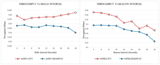 Throughput comparison between VANET scenarios and Beacon/Hello intervals.