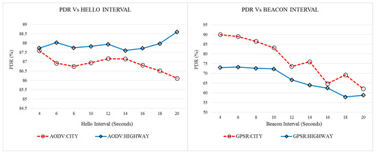 PDR comparison between VANET scenarios and Beacon/Hello Interval.