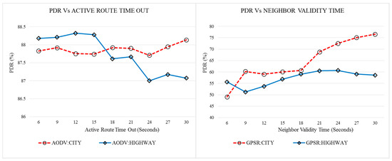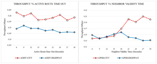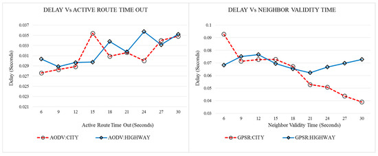 Figure 10 presents the delay performance of AODV and GPSR across various route validity times in both city and highway environments. The findings indicate a distinct preference for shorter route validity times in AODV, while GPSR benefits from longer validity durations. This contrast highlights the differing operational dynamics and requirements of these two routing protocols under varying mobility conditions. In the case of AODV, the observed delay variations are minimal, less than 0.007 s, regardless of the route validity time employed. This stability suggests that AODV is effective in maintaining low delay even when the route validity time is adjusted. AODV’s reactive routing mechanism, which involves establishing routes on-demand, means that shorter validity times facilitate frequent updates. Although this might seem counterintuitive, in scenarios where network topology changes are less frequent—such as in a city—AODV can quickly adapt to any changes without incurring significant delays. Therefore, the preference for shorter route validity times in AODV enhances its efficiency by reducing the likelihood of routing failures, ensuring timely packet delivery with minimal delay. Conversely, GPSR exhibits a pronounced response to route validity time, particularly in urban environments where the delay improves significantly with longer validity periods. The observed variation in delay for GPSR exceeds 0.05 s in the city and is below 0.01 s on highways. In city conditions characterized by lower mobility and relatively stable topologies, longer route validity times reduce the frequency of route discovery processes. When route validity times are extended, the protocol can maintain existing routes longer, thus minimizing unnecessary overhead associated with frequent updates. This decrease in protocol overhead directly correlates with improved network performance, as less routing traffic leads to reduced congestion and lower overall delay. In essence, GPSR’s reliance on longer route validity times allows it to capitalize on the stable node density characteristic of city environments, leading to enhanced efficiency in data transmission. The differences in delay response between AODV and GPSR can also be attributed to their underlying routing mechanisms. AODV’s design favors adaptability through shorter route validity periods, which allows it to respond quickly to changes in the network topology, albeit with a trade-off in slightly increased delay. Conversely, GPSR’s performance benefits from maintaining routes for extended durations, reducing the need for constant route discovery and thus mitigating delays. The ability of GPSR to harness higher node densities and stable connectivity in urban settings allows it to thrive under conditions that would impose greater delay on AODV. In summary, the delay observations in Figure 10 highlight the contrasting routing strategies of AODV and GPSR in relation to route validity time. While AODV achieves low delay with shorter validity periods by fostering rapid route adjustments, GPSR capitalizes on the stability afforded by longer validity times to enhance performance in urban settings. These findings underscore the necessity of tailoring routing protocols to the specific characteristics of their operating environments to optimize delay and overall network performance. Understanding these dynamics is crucial for the development of efficient routing strategies in both high-mobility and stable network scenarios.
