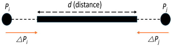 In PBD, the process of restricting particle movement is formulated as a constraint function, also known as a constraint [7]. Figure 1 shows the distance constraints that are basically applied to the PBD solver. The PBD solver is versatile, accommodating a broad array of constraint sets, making it applicable to numerous physical concepts, including fluids, cloth, and volumes. The constraint function is generalized as C (p + ∆p) = 0, where C represents the constraint function, p the initial position, and ∆p the position increment that preserves the constraint when added to the initial position. To solve for p, the equation is approximated as follows: