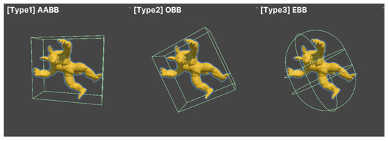 To address these issues, many studies have focused on optimizing the collision detection stage and improving performance by implementing culling processes. The culling process omits complex calculations in scenarios where collisions are unlikely. Collision detection methods that utilize the culling process are divided into a broad phase and a narrow phase. In the broad phase, geometric structures such as axis-aligned bounding boxes (AABBs), object-oriented bounding boxes (OBBs), and ellipsoidal bounding boxes (EBBs) are employed to quickly identify potential collisions. In the narrow phase, detailed collision checks are carried out for collisions identified in the broad phase. An AABB is defined as the smallest rectangular parallelepiped that fully encloses an object, with each face aligned parallel to the coordinate axes. An AABB’s primary advantage is its ability to conduct rapid intersection tests by simple coordinate value comparisons. However, its alignment with objects rotated relative to the axes is poor, resulting in substantial empty space within the bounding volume. An AABB is characterized using the maximum and minimum points and performs intersection tests by comparing six parameters. An OBB, in contrast, is a bounding parallelepiped whose faces and edges are not aligned with the object’s reference axes. An OBB can rotate to match the object’s orientation, allowing for a more precise and tighter enclosure. This precision is achieved by determining the box’s position and orientation in space using the object’s center point, represented as a 3D vector (x, y, z), and axes defining the object’s direction. An EBB is defined as the smallest ellipsoid completely enclosing an object in three-dimensional space. Unlike an AABB or OBB, an EBB provides a bounding volume that closely conforms to the object’s actual shape. This feature is particularly beneficial for objects with curved surfaces or irregular geometries, as the ellipsoidal shape ensures a tighter fit and more accurate representation. An EBB’s most notable feature is its ability to minimize empty space within the bounding volume, thereby enhancing collision detection algorithms’ efficiency and reducing false positives. However, intersection tests with EBBs are more computationally intensive than those with AABBs or OBBs, due to the complex mathematical calculations required to ascertain whether a point resides within an ellipsoid. Figure 2 represents the differences in shape between AABBs, OBBs, and EBBs.