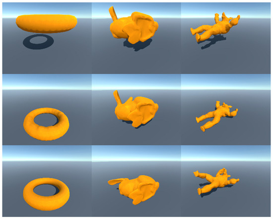 Our proposed simulation results for deformable objects are shown in Figure 3. We tested this by allowing models—Torus, Bunny, and Armadillo—to collide with the floor after free falling in a real experiment setting; this enabled us to evaluate the robustness of our simulation.