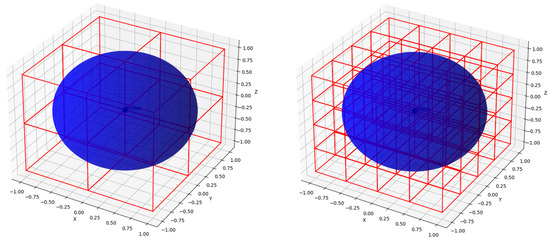 The broad phase using a BVH involves several functions. The first is constructing the level of AABB (LoA) for the model, using the octree structure LoA. We set the largest AABB surrounding an object as level 0, divide it into eight, and continue to divide it down to level 3. For any model, dividing up to level 3 results in a total of 73 AABBs. The second function updates the segmented AABBs based on the model’s deformation. Various external forces and collisions deform real-world objects, altering their appearance. Consequently, the appearance of the surrounding AABBs also continually changes, requiring steps to adapt. We employ the new compute shader to update the AABB information to level 3. The third function involves using the updated AABB information to calculate box–box collisions between different objects, a highly efficient and well-known method. We utilize the compute shader to check two invoked AABB boundaries for collisions. The resulting collision detection data are stored in a buffer or 2D texture for subsequent steps. Finally, we design a data structure linking the LoA to the model’s face triangle. Figure 4 shows the Level of AABB (LoA) with sphere model. This data structure is continually modified and updated with each frame. If a triangle’s vertex lies within the box, we represent this in our data structure as being contained within the box. During this process, we encountered overhead in determining whether a triangle’s vertex was within the box and recognized the need for an algorithm to optimize these updates in future.