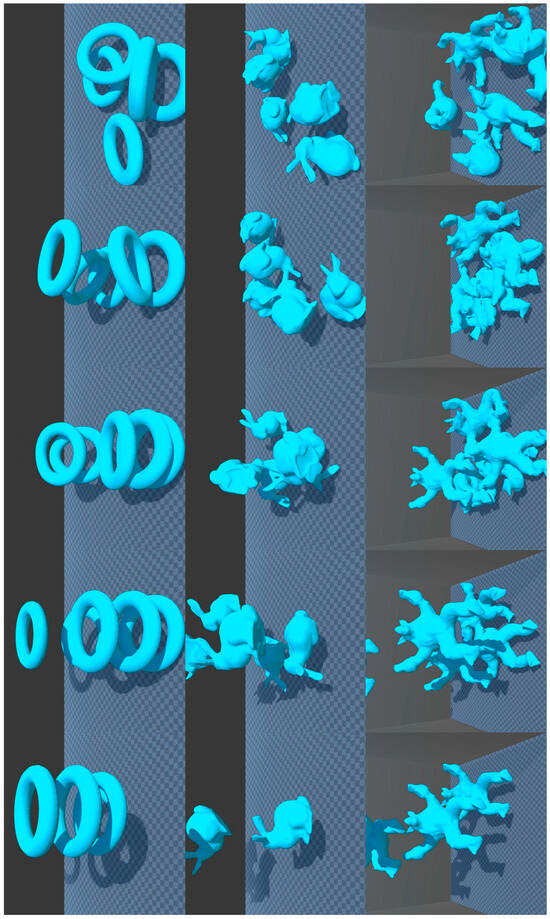 We dispatch the parallel processing kernel (PP) for the triangle–triangle pair to calculate the response. Then, to recompute the response for each node, we dispatch the PP based on the node. We developed an algorithm with this structure to address any concurrency issues that might arise. Figure 5 shows the results of our proposed collision handling in the Unity engine, simulating each scene with 7 and 10 models. The experiment’s focus was to determine whether multiple models suffer significant volume blow-ups during overlapping collisions.