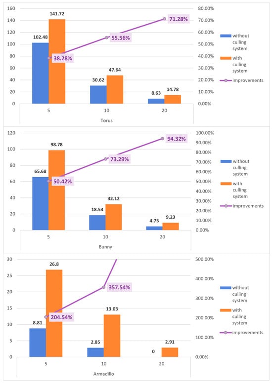 Figure 6 shows the final performance comparison results from the experiment. The performance differential between methods without the AABB-based BVH and those with it ranges from a minimum of 38% to a maximum of over 350%. Notably, as the models become more intricate and complex, the rate of performance improvement escalates sharply. These results confirm that for real-time simulations, applying a suitable level of GPU-based parallel algorithms in collision detection and response algorithms is beneficial. Furthermore, using multiple BVH layer results, we discovered that it is advisable to store and utilize the result values through textures to enhance performance.