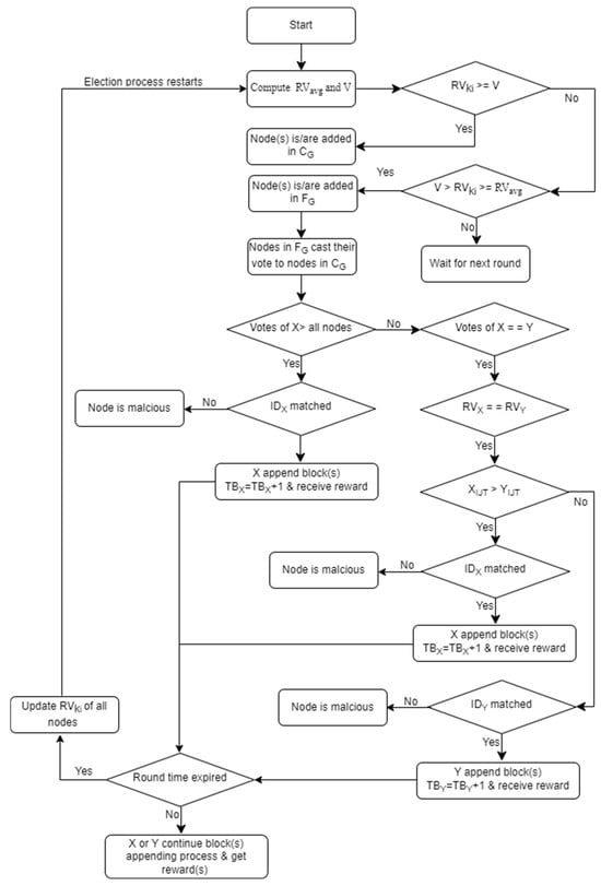 The leader selection process is started after the completion of adding network nodes in the CG and FG processes. A leader node is selected from the members of the CG by using the voting process, and the members of FG will cast their votes to the members of CG. A node in the CG that receives more votes from the members of the FG than other nodes becomes the leader for appending block(s) in the chain. Now, in the case where two or more than two members of CG received an equal number of votes, then their RVs are checked and the member or node with the highest RV is the leader. Also, in the case where the RVs of the nodes are equaled, then the initial joining time of the nodes is checked and the node that has joined the network earlier than others is the leader. Once a leader node is decided, then it starts the process of appending block(s) to the existing chain. The number of successful appending block(s) in the chain will not only increase the RV of the leader, but it will also receive some incentives as a reward in the form of money. Otherwise, in the case of unsuccessful attempt(s) of the appending block(s), the leader will face a penalty in the form of money, and, also, their RV will be decreased. When the round time of the leader is expired, the RVs of all network nodes are updated, and the process of selecting a new leader is restarted. The entire process is shown in Figure 1 and Algorithm 1.