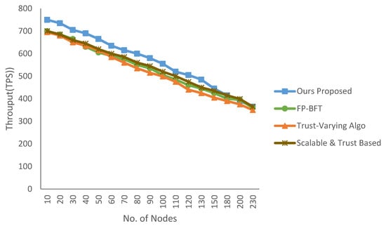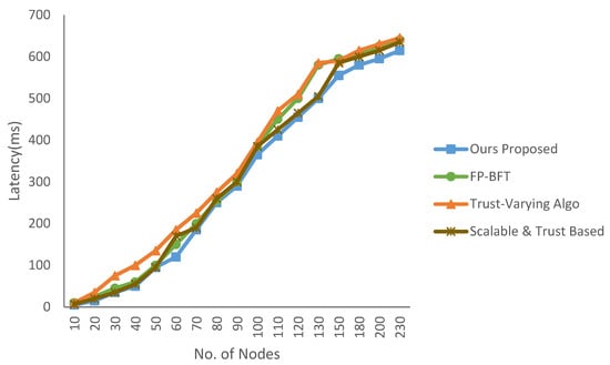 The latency goes on increasing once the number of nodes is increased, as shown in Figure 3. When the number of nodes is 10, the latency is the lowest, which means that the latency for the proposed algorithm is 5, and for that of FP-BFT and Trust-Varying Algorithm, it is 10. Once the number of nodes starts to increase, the latency shows a gradual increase. At 100 nodes, the latency for the proposed consensus algorithm is 365, while that for FP-BFT is 385 and for Trust-Varying Algorithm is 395. At 130, the latency for the proposed algorithm is 500, and for that of FP-BFT, it is 580, and for the Trust-Varying Algorithm, it is 585. The reason behind this is the time to process the transactions and block creation. Since only valid nodes in the proposed consensus algorithm are allowed to participate in the consensus process, this further reduces the time of the voting process to be completed and, hence, the latency is reduced to a considerable level. However, a major difference between the proposed consensus algorithm and that of FP-BFT and the Trust-Varying Algorithm is not observed in terms of performance. The latency in comparison with the Scalable and Trust-Based consensus algorithm is similar when the batch size is smaller, but once the batch size goes on to increase, we observe heavy fluctuations in the latency, particularly in the behavior of Scalable and Trust-Based consensus algorithms. At the same time, a minor or no heavy variation is observed in the behavior of the proposed algorithm when the batch size is increased. But, the overall latency in all four compared models shows similar or minor changes, and it can be said that, for latency, all four work almost similarly with negligible variations.
