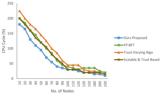 Two parameters have been evaluated in terms of resource consumption: (1) CPU cycle consumption and (2) bandwidth consumption. Figure 4 shows CPU cycle consumption when the number of nodes is increased. It can be seen that, once the nodes are added to the network, the CPU utilization increases, and the performance of the CPU is reduced. So, initially, when there was a smaller number of nodes, the performance of the CPU was higher, but, when the number of nodes continued to increase, the performance of the CPU continued reducing. The main reason behind this is that, with an increasing number of nodes, more exertion is initiated by the CPU, which exhausts its performance and, hence, the process takes longer to complete. The comparison is performed with FP-BFT, Trust-Varying, and Scalable and Trust-Based consensus algorithms. It is observed, in all four cases, that, with the increasing batch sizes, more CPU cycles are consumed and the performance of the CPU is reduced. However, it is better, in the case of the proposed consensus algorithm, when the number of nodes is lower, and, with an increase in the batch size, the CPU cycle of the proposed algorithm becomes almost similar to the Scalable and Trust-Based consensus algorithm. This means that, with an increasing number of nodes, the Scalable and Trust-Based consensus algorithm works better as compared to the other two benchmarks.