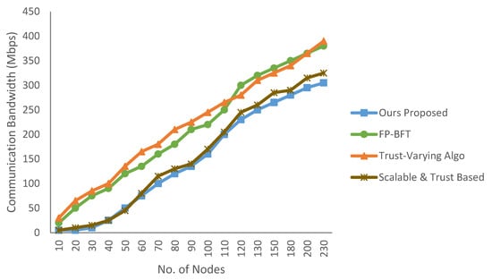 Communication overhead is the number of extra bits that are sent during the transmission in addition to the original message, which increases bandwidth consumption [43]. Similarly, more bandwidth is consumed when the number of nodes is increased in the network. Figure 5 shows the resource consumption second part, which is the bandwidth consumption with an increasing number of nodes. It is clear from Figure 5 that, when more nodes are added to the system, they require more bandwidth to transmit their decisions/votes to the servers. Hence, it puts exertion on the available bandwidth, requiring more bandwidth to accommodate the needs of an increasing number of nodes. Initially, when the number of nodes was lower, the bandwidth required for both models was lower. However, the number of nodes is added gradually, and the bandwidth consumption is enhanced for both models. In the case of the proposed consensus algorithm, there is a slight reduction in the consumption of bandwidth as compared to the FP-BFT and Trust-Varying Algorithm. The main reason is that there is a tight scrutiny process that eliminates the malicious nodes to consume the bandwidth and, hence, the bandwidth is only consumed for valid transmission. This reduces pressure on bandwidth to some extent. However, for the communication bandwidth consumption as compared to the Scalable and Trust-Based consensus algorithm, we observed a similar behavior right from the beginning. However, slight variations were observed with the increase in the batch size until the batch size reached 230 nodes, but the overall consumption of the bandwidth remained the same.