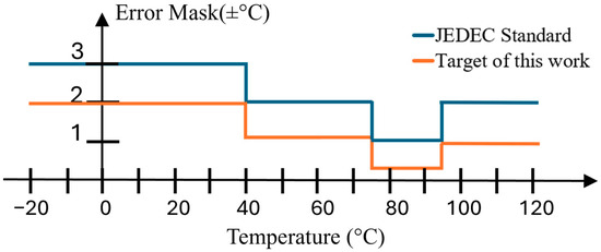 Temperature sensors for thermal management require specific accuracy at throttling temperatures, distinct from those applicable across broader temperature ranges, to ensure optimal performance and reliability [20]. The Joint Electron Device Engineering Council (JEDEC) 21-C standard, represented by the blue line in Figure 1, establishes a thermal mask for the chip-level and board-level temperature sensors used in power and thermal management, specifying a maximum temperature error of ±1 °C within the 75 °C to 95 °C range [22]. However, the temperature variances commonly encountered during actual testing necessitate a level of precision beyond the standard guidelines. This work, signified by the orange line in Figure 1, commits to this temperature interval and advances the accuracy beyond the standard, targeting an optimal worst-case temperature error of ±0.1 °C within this critical range. Beyond this range, this work aims to maintain the standard accuracy of ±1 °C. This level of precision makes the sensor especially suited to integration across chips where precise thermal monitoring is crucial.