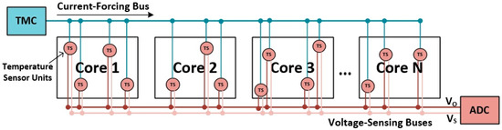 Each core contains several temperature sensor units strategically placed around the hotspots. Although only a few sensors are depicted in each core for clarity, the actual number of sensors can be much higher. This is due to the extremely compact design of the sensors, which allows for their dense placement around thermal hotspots. Two voltage-sensing buses connect the outputs of all of the sensor units, carrying the sensor data to an Analog-to-Digital Converter (ADC) for further processing.