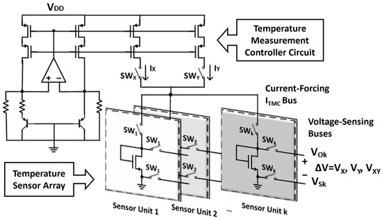 Figure 3 provides a detailed schematic of the temperature sensing circuit. This work employs the Banba bandgap reference circuit [26] as the TMC, employing switches, SWX and SWY, to generate two types of bias currents, IX and IY, for the temperature sensor array. The sum of the two currents, IXY, can be simply and accurately generated in the TMC without additional hardware costs. A single TMC circuit can supply input currents to numerous small-sized sensors via the dedicated current-forcing ITMC bus.