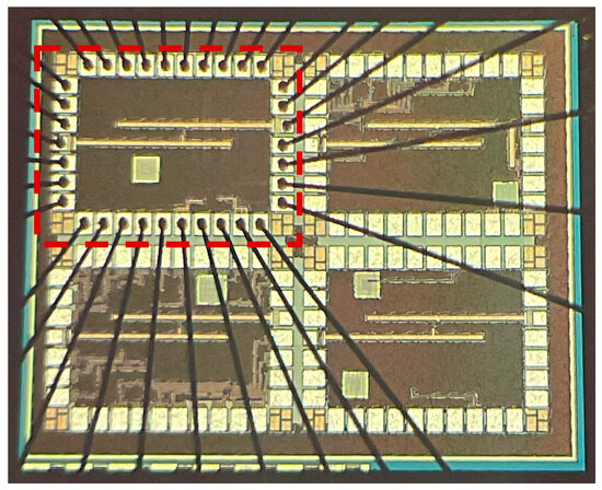 Photograph of the chip of the temperature measurement system (highlighted within the red dashed block).