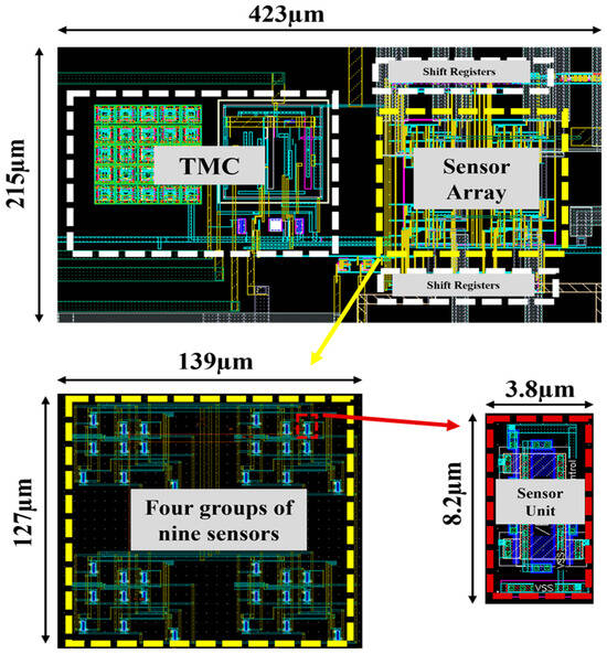 Figure 6 presents a detailed layout of the temperature measurement system, highlighting the TMC circuit, an array of 36 temperature sensors, and shift registers that manage the selection of the currents and sensors. The temperature sensor array is organized into four groups of nine sensor units, with varying distances between them to facilitate potential measurement of the temperature gradients across the chip in future studies. Consequently, the overall area of the system and sensor array includes these larger-distance gaps. The figure also emphasizes the compact design of the sensor unit, with dimensions of 3.8 µm by 8.2 µm, ensuring efficient use of the chip space.