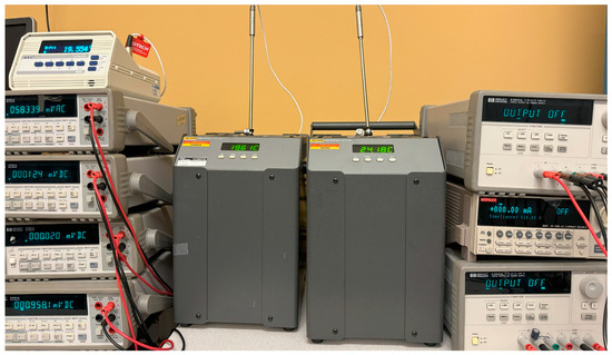 As shown in Figure 7, this work utilized the Fluke 7103 oil bath to adjust the sensor temperatures from −10 °C to 100 °C, a range selected based on the oil’s accuracy and cost considerations. To simulate the temperature variations between the TMC and the sensors, two PCBs were used: one serving as the TMC current source and the other hosting the sensors. These PCBs were placed in separate oil baths and connected via a current pin to the ITMC bus of the two dies. Temperature estimations for the sensors were conducted through measurements on the sensor die. Each temperature stabilization phase in the oil baths took approximately 30 min, which was the most time-consuming aspect of the experimental process. To optimize the testing efficiency, all of the data necessary for characterization and calibration were collected within the same thermal run. Repeated measurements, with 40 repetitions for this work, were taken from each sensor to mitigate noise and enhance the data reliability; the average of these measurements forms the basis of the data processed. A precision resistance thermometer CTR2000 was inserted into the oil to measure the sensor temperatures.