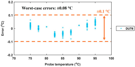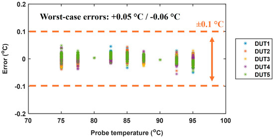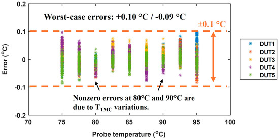 The temperature errors of the 180 sensors on five DUTs are illustrated in Figure 11. The TMC currents for these 5 DUTs were provided by DUT 6. The coefficients of the temperature formula were extracted from measurements from the three training set DUTs conducted at the twelve temperatures listed in Table 1. All the other sensors and measurements at different temperatures were used for verification. In case 3, the worst-case inaccuracy was +0.1 °C/−0.09 °C from 75 °C to 95 °C. Due to the consideration of the TMC temperature variations in case 3, there are nonzero errors at the two calibration points, unlike the previous two cases. While more measurement noise is involved due to the use of two separate oil baths and two separate test chips, the temperature measurement errors are only slightly worse compared to those in the previous two cases.