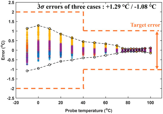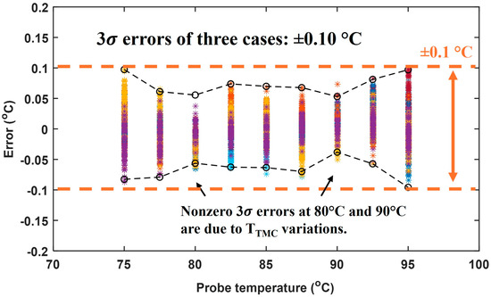 After analyzing the temperature errors for the three cases, it is essential to assess the overall performance using 3-sigma errors. Figure 12 and Figure 13 provide a comprehensive view by combining the temperature errors in all cases. Figure 12 focuses on the critical temperature range of 75 °C to 95 °C, presenting the 3-sigma error lines for a detailed accuracy evaluation. The results show that the 3-sigma errors remain within ±0.1 °C, meeting the stringent accuracy requirements. This close grouping around the zero-error line highlights the sensors’ exceptional precision within this range, which is vital for thermal management applications, such as data centers, where even minor temperature fluctuations can significantly impact performance and reliability.