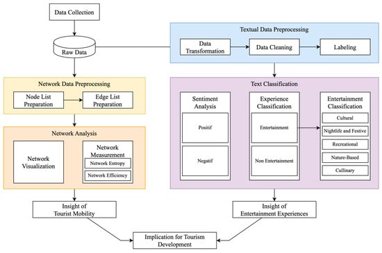 Our study employs a focused methodological framework combining advanced machine learning and network analysis to address two distinct objectives, as shown in Figure 1. Text classification, powered by BERT, analyzes user-generated content to identify tourists’ perceptions of entertainment experiences. Meanwhile, network analysis examines mobility patterns, mapping how tourists move between destinations to uncover travel behavior.