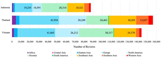 This study employed a systematic data collection process using TripAdvisor, a globally recognized travel platform. The 75 key tourist destinations—25 from each of Indonesia, Thailand, and Vietnam—were selected based on the top-ranked locations on TripAdvisor, determined by the number of reviews for each destination. These destinations encompass a diverse range of attractions, including landmarks, natural wonders, cultural heritage sites, and historical locations. Data collection was conducted up to August 2023, covering the pre-pandemic, pandemic, and post-pandemic periods. This inclusive timeframe was deliberately chosen to capture shifts in tourist behaviors and mobility patterns influenced by global events. TripAdvisor was selected due to its established reliability in providing User Generated Content (UGC) that reflects authentic tourist experiences and perceptions [36,40]. Using web scraping techniques, we archived review text and contextual information from all selected destinations, preserving a comprehensive digital record of tourist experiences. The final dataset, comprising 387,010 reviews, forms a robust foundation for analyzing tourist experiences and mobility patterns across Southeast Asia.
