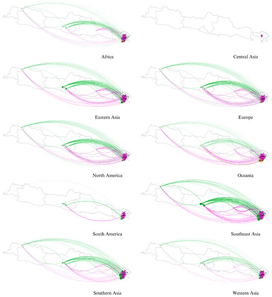 In our study, we develop distinct network datasets for Indonesia, Thailand, and Vietnam, resulting in three separate node lists and corresponding edge lists. This country-specific approach to network construction enables comparative analysis of tourist movement patterns both within individual nations and across the broader Southeast Asian region. The development of separate networks for each country facilitates deeper understanding of regional tourism dynamics, revealing unique patterns in cultural preferences, popular travel routes, and the influence of tourists’ origins on destination choices across Southeast Asia. This structured approach to network analysis provides a robust framework for examining how different cultural groups navigate and experience each country’s tourism offerings.