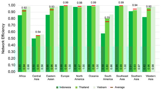 Network efficiency measures how effectively information flows through the network structure, evaluating how nodes connect and interact with each other. Based on global efficiency theory, this metric assesses the ease of movement between different network points. The efficiency calculation considers the inverse of shortest path lengths between nodes, providing insights into the accessibility and connectivity of destinations. For any two nodes i and j in the network, the efficiency (Eij) equals 1 divided by their distance (dij). The shorter the distance, the higher the efficiency.