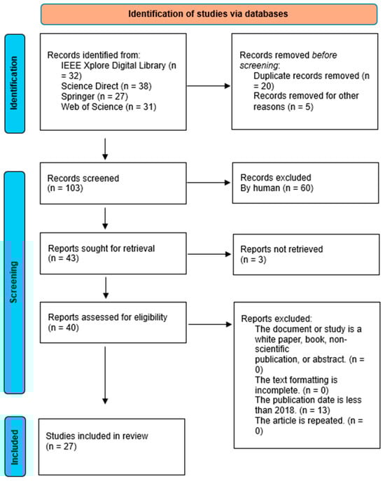 In the identification stage, 128 records were collected from 4 databases: IEEE Xplore Digital Library (32), Science Direct (38), Springer (27), and Web of Science (31). A total of 25 records were removed before the screening process (20 due to duplicates and 5 for other reasons). In the screening phase, 103 records were reviewed, of which 60 were excluded after a human evaluation because their results were unclear and the technologies used were not considered significant. Subsequently, 43 reports were retrieved, but 3 could not be obtained. In the eligibility stage, the 40 studies were assessed, excluding 16 because their publication dates were earlier than 2018. Finally, 27 studies met the inclusion criteria and were used for the review.