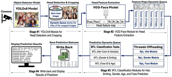 35]. Therefore, we employ a pre-trained model of VGG-Face to accomplish hair and facial feature extraction since it adopts only 3 × 3 kernels in all convolutional layers. Thus, the input to the VGG-Face network is a head image resized to a resolution of 227 × 227. In the third stage of the pipeline, feature maps are offloaded to edge computers to perform parallel multitask classification. Finally, during stage four, the classification results are sent from the edge device back to the edge server to provide detailed face analysis and decision-making. Therefore, the developed framework is designed to process four images incrementally through four pipeline stages. For instance, when all four stages become full, it indicates that the output decision-making of the first head image is in the write-back stage. The second image is being classified using three parallel MTL-based classification modules. The third image is undergoing feature extraction using VGG-Face. Lastly, YOLOv8 scans the fourth image for head detection in the first stage. These parallel incremental operations are clearly illustrated in