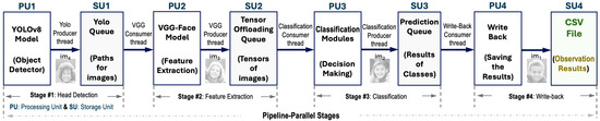 Figure 5, the inference of the proposed architecture is designed to process four images (im1, 2, 3, and 4) of different individuals concurrently. This implies that when the first image (im1) reaches the write-back stage to be saved in a CSV file, the predicted classes of im2 are enqueued into the prediction queues, the tensor of im3 is inserted into the offloading queue, and the path of the cropped head (im4) from the YOLO model is placed into the YOLO queue.