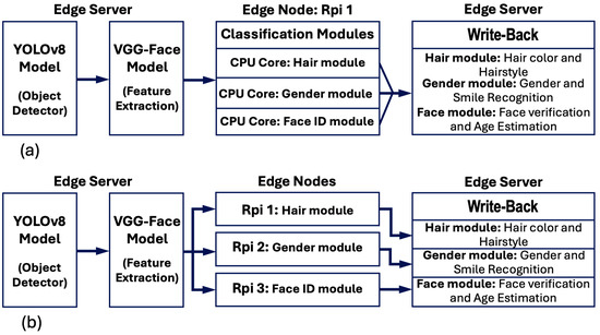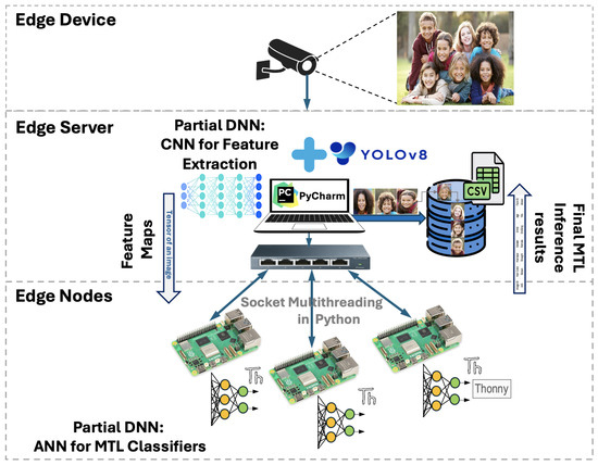 Figure 6b. The cluster involves four computing devices, including a single powerful edge server and three Raspberry Pi edge computing devices. To enable the server to handle multiple clients’ requests simultaneously, it is configured as a multithreaded server. Thus, the server assigns a thread for each edge device, and each thread works on two main temporary buffers (queues). It enqueues tensor elements to the feature map queue, whereas the received prediction outcomes for the edge nodes are inserted into the prediction queue. The two queues allocated to each edge device enable parallel processing for multiple classification tasks and parallel saving of prediction outcomes. Consequently, the deployed computation offloading approach refers to distributing face analysis computations based on task complexity and resource-rich/limited edge devices. In this context, extracted feature maps from detected heads are offloaded to the developed MTL-based classification modules, where these modules represent the dense layers of the modified VGG-Face model, illustrated in