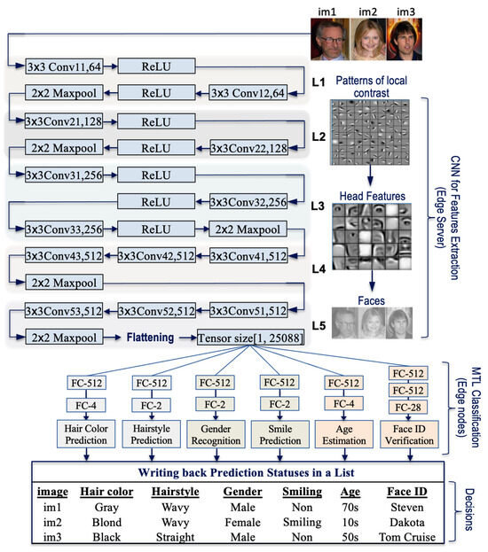 Figure 7. As observed, all the classification models require two fully connected layers for decision-making, except the face recognition model, which is constructed using three fully connected layers to increase the efficiency of face recognition. It is important to note that the ability to generalize the proposed edge computing-based architecture across various models primarily relies on two factors: the capability of the tasks to be learned simultaneously through the multi-task learning (MTL) approach, and the model’s flexibility to be adapted for different tasks.