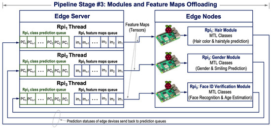 Section 4.3. When an edge device connects to the edge server, the corresponding client thread consumes a feature map from the client’s queue and sends it to the respective device. For instance, when Rpi1 sends a request to the server asking to send an image tensor for hair color and style classification, the server accesses the feature map queue of Rpi1, retrieves an image tensor, offloads it to Rpi1, and waits for prediction outcomes. Once Rpi1 finishes predicting hair color and style, it sends the predicted classes back to the server. The server enqueues the received outcomes of hair into the prediction queue. Meanwhile, it obtains another image tensor from the tensor queue of Rpi1 and offloads it to edge node Rpi1. Thus, in stage #3, the server assigns a thread for each edge device request. However, each thread performs two sub-tasks. The first sub-task retrieves a new feature tensor from the feature map queue and offloads it to the client, while the second sub-task enqueues the received predictions into the CSV prediction queue. During stage #4, a write-back thread assigned by the server consumes predictions from the prediction queue and writes the results to a CSV file for saving. Consequently, as depicted in