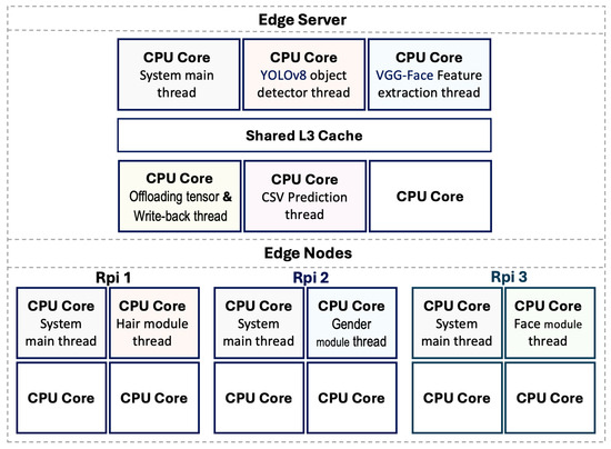 61]. Hence, we utilize multithreading across multiple cores of processors to increase parallelism, allowing for the concurrent execution of independent threads on multiple cores of multiple processors. Moreover, the proposed pipeline-parallel design employs a multi-instruction stream multi-data stream (MIMD) architecture. This is due to multiple processing components executing various instruction streams and multiple images are processed by different processors’ cores simultaneously. In contrast, the single-instruction stream multi-data stream (SIMD) architecture is implemented within each processor core by executing the same instruction stream, i.e., multiplication or addition, on different data streams, since each image is passed through multiple pipeline processing stages. Implementing the MIMD architecture instead of the SIMD architecture for the proposed deep face analysis system is advantageous. This approach allows for the simultaneous processing of multiple distinct instructions on different data streams, making it well-suited for the diverse tasks involved in various stages of the pipeline. Our architecture utilizes a multitask pipeline-parallel strategy, where different stages of the pipeline operate concurrently on separate processors. Consequently, the MIMD architecture supports this design by enabling distinct operations, such as detection and feature extraction, to occur in parallel without the synchronization constraints that are inherent in SIMD systems. Consequently, the proposed architecture utilizes parallelism at three levels (instruction, data, and thread). Furthermore, parallelism occurs across the multicore processor of the edge server and different processors of the edge cluster, including cores for the edge server and edge computing devices. This implies that the processing mechanism of the proposed architecture has been accelerated by running multiple independent threads simultaneously. Each algorithm is forwarded to a specific core, where each core performs a single module of the proposed pipeline-parallel face analysis architecture. For instance, DNN models that involve computationally intensive operations are directed to one core of the edge server processor, i.e., YOLOv8 and VGG-Face models are assigned to run on two cores of the edge server. On the other hand, the classification modules encompass lightweight operations compared to the YOLOv8 or VGG-Face networks; thus, a single co-processor of an edge device is dedicated to each classification module, as illustrated in