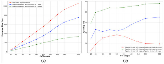 Figure 6a illustrates the design of the pipeline-parallel architecture with multithreading on a single edge node, while the design of the pipeline-parallel architecture with multithreading on three edge devices is shown in