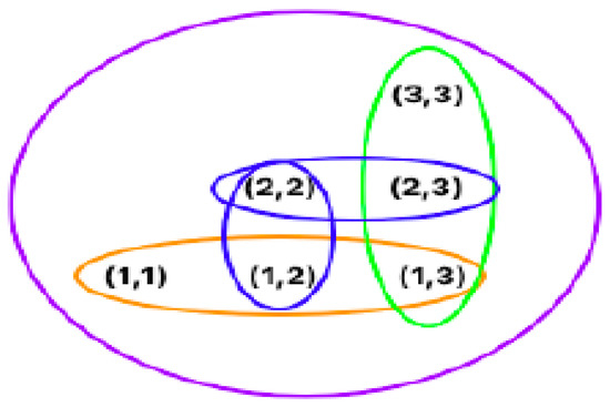 The aim of this article is to present a new mathematical formalism to support all NLP methods based on the general idea of contextual semantics. Thus, we propose an alternative to the standard word embeddings, which is based on a different mathematical structure (instead of normed spaces) developed using algebras of subsets endowed with the usual set-theoretic operations (Figure 1). In a given environment and for a given specific analytical purpose, the meaning of a term may be given by the extent to which it shares semantic context with other terms, and this can be measured by means of the relations among the sets representing all the semantic elements involved [10,11]. The value of the expression “the term v shares the semantic environment with the term w” can be measured by a real number in the interval given by a direct calculation, which is called the semantic projection of v onto This representation by an index belonging to is also practical when we think about the interpretation of what a semantic projection is, since it can be understood as a probability—thus facilitating the use of Bayesian tools for further uses of the models—as well as a fuzzy measure of how a given term belongs to the meaning of another term—thus facilitating the use of arguments related to fuzzy metrics.