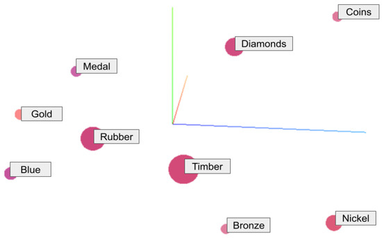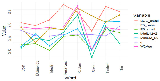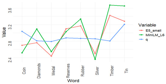MiniLM-L12-v2 shows the most distinctive differentiation with the strongest distinction between metal and non-metal terms. Gold–Silver maintains the highest similarity (0.732) among all pairs, and there are very low similarities for unrelated pairs (Timber–Coin: 0.144) (Table A10). L2 distances show the largest range, indicating strong discrimination capability (Table A11).