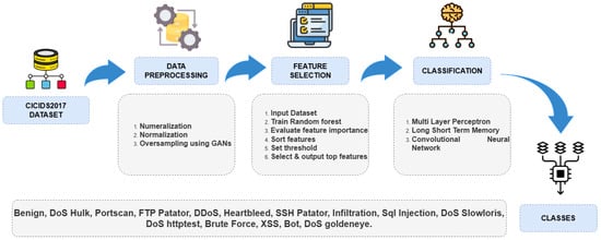 These current systems mentioned in the literature review are computationally intensive, which extends the training period and lowers their overall efficiency. Using deep learning (DL) algorithms [] on the CICIDS 2017 dataset, this study aims to recommend an embedded methods-based IDS. DL, a crucial area of study in ML, relies on a neural network (NN) with two or more hidden layers. To automatically learn and extract features from large datasets, DL is superior, and it has shown promising results []. DL models still need feature engineering when dealing with high-dimensional structured data. A significant rate of false positives in the real-world network environment may result from the model overfitting during training due to the presence of large-dimension, redundant, and irrelevant features.