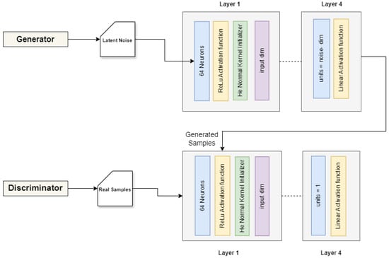 To deal with the issue of skewed datasets, oversampling methods are frequently employed []. Typical techniques, such as the Adaptive Synthetic Sampling (ADASYN) approach and the Synthetic Minority Oversampling Method (SMOTE), create samples from the closest neighbors via interpolation [,]. Compared to ADASYN and SMOTE, Generative Adversarial Networks (GANs) are more effective in resolving class imbalance because they create realistic and diverse synthetic samples for both minority and majority classes, maintaining the original data features and lowering the risk of overfitting [,]. GANs are efficient in managing complicated and diverse datasets due to their adaptability and capacity to learn underlying data [,]. The comparison of methods for resolving class imbalance is shown in Table 1.