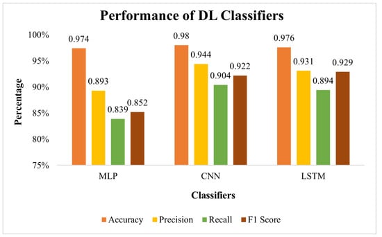 F1 score, accuracy, precision, and recall of DL classifiers.