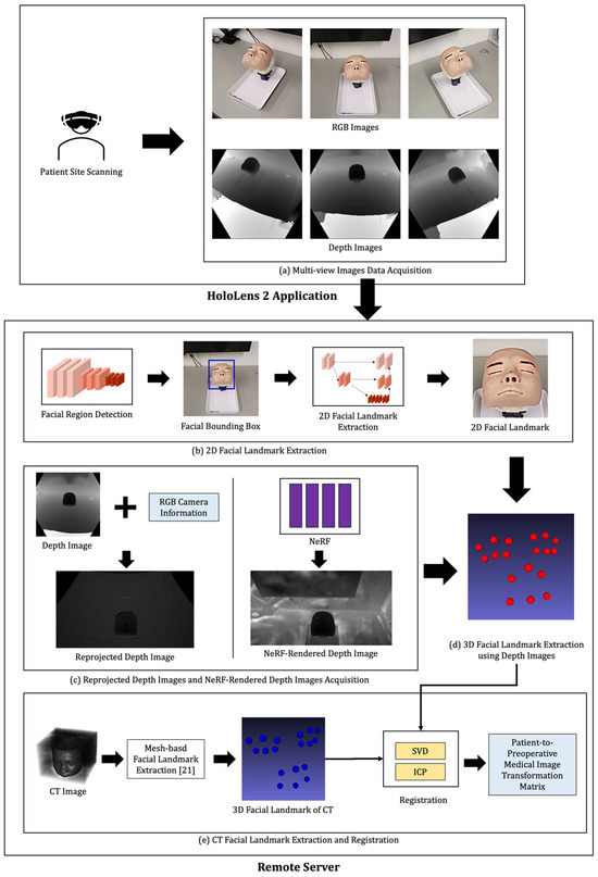 - Kim, S.; An, H.; Song, M.; Lee, S.; Jung, H.; Kim, S.; Jung, Y. Automated Marker-Less Patient-to-Preoperative Medical Image Registration Approach Using RGB-D Images and Facial Landmarks for Potential Use in Computed-Aided Surgical Navigation of the Paranasal Sinus. In Advances in Computer Graphics: 40th Computer Graphics International Conference, CGI 2023, Shanghai, China, 28 August–1 September 2023; Proceedings, Part IV; Springer: New York, NY, USA, 2023. [Google Scholar]